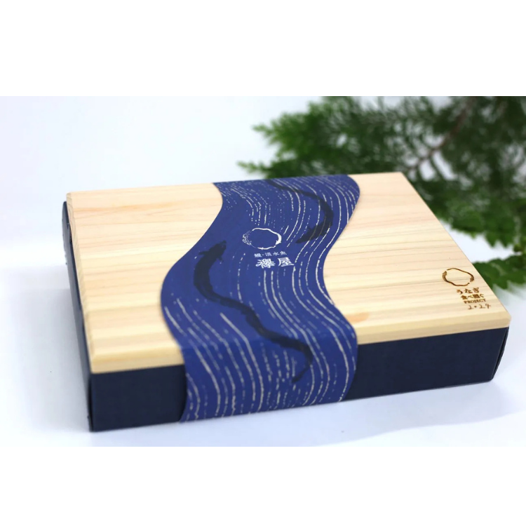 襷のように箱に巻かれた帯にはウナギが川で生き生きと泳ぐ様子をイメージいたしました。